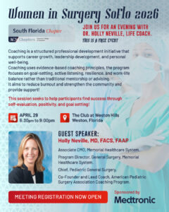 Come join us on April 29th for the 2026 SoFlo Women In Surgery Meeting at The Club at Weston Hills Country Club in Weston, FL. The meeting will take place from 6:30 – 9:00pm and features guest speaker Holly Neville, MD.Holly is a surgeon and life coach who provides evidence-based coaching to guide doctors and…